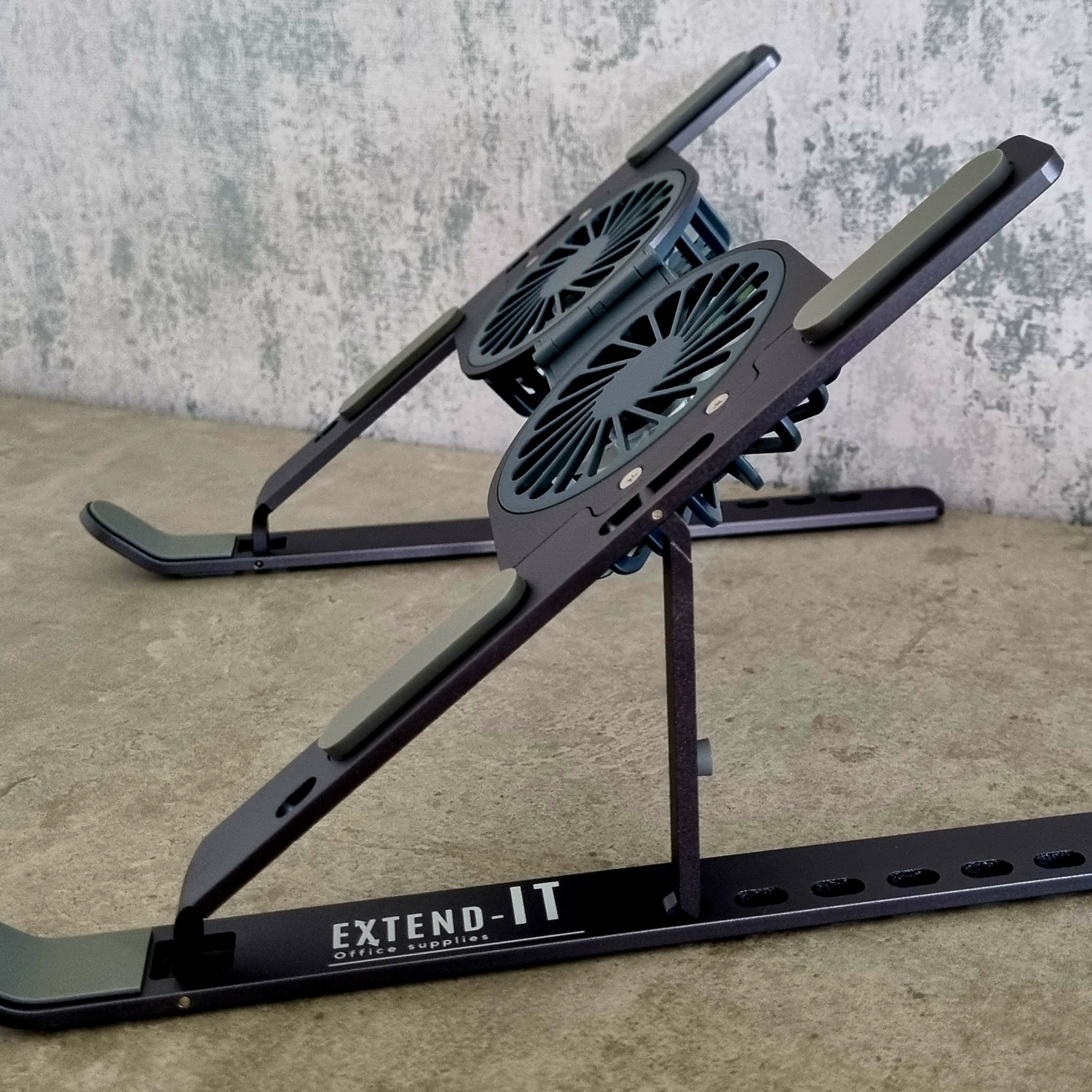 The ultimate companion for your on-the-go work experience. Crafted from high-quality aluminium, this laptop stand not only provides a sturdy frame for laptops of various sizes but also incorporates powerful cooling fans to ensure optimal performance.